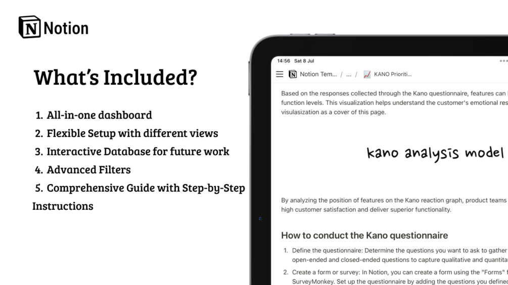 Notion is the ideal platform for this template as it provides an intuitive interface for streamlined Kano analysis. Collaborate seamlessly with your team, visualize your product roadmap, and make data-driven decisions using Notion's aesthetic and versatile workspace.