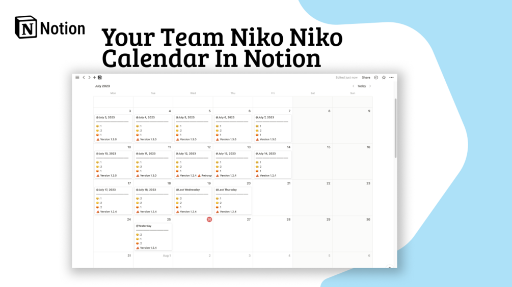 Unlock the full potential of your team with the Niko Niko Calendar. Seamlessly integrated into Notion, it empowers your team members to track emotions, communicate openly, and build resilience together. Enhance team dynamics and emotional well-being – Start using the Niko Niko Calendar today!